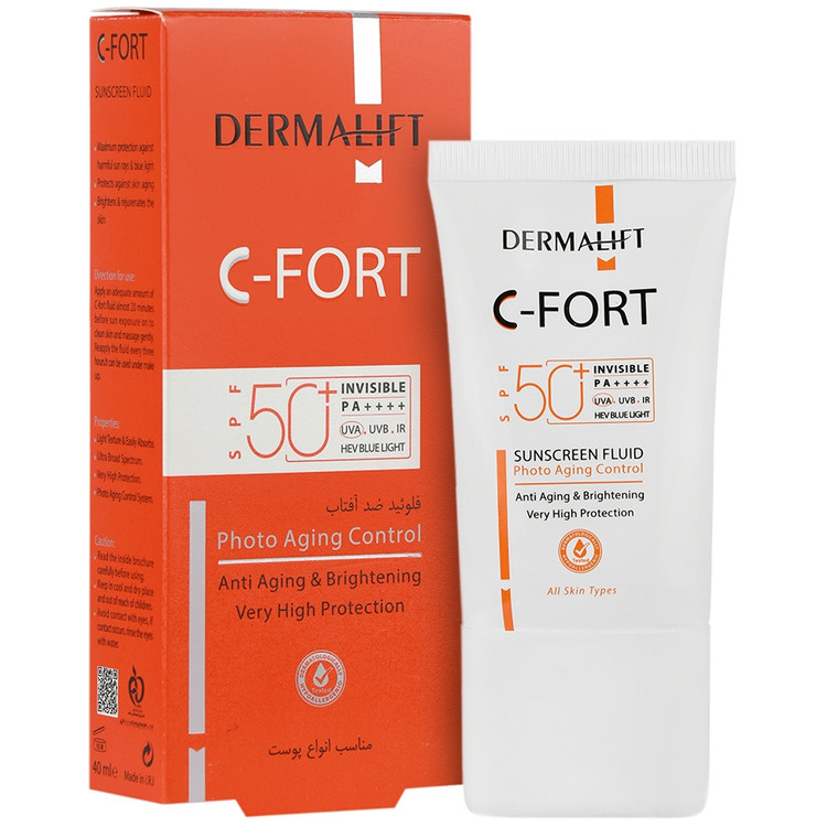 ضد آفتاب فلوئیدی حاوی ویتامین سی ، مناسب انواع پوست ، حفاظت از پوست در برابر اشعه مضر افتاب و نور آبی ، پیشگیری از پیری زودرس پوست، احیا کننده وجوان کننده پوست
